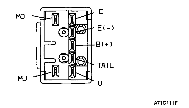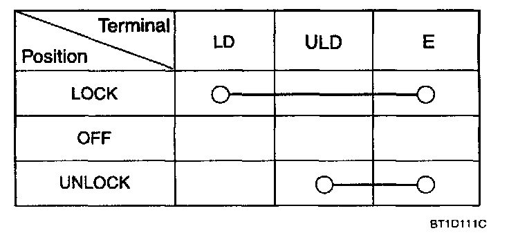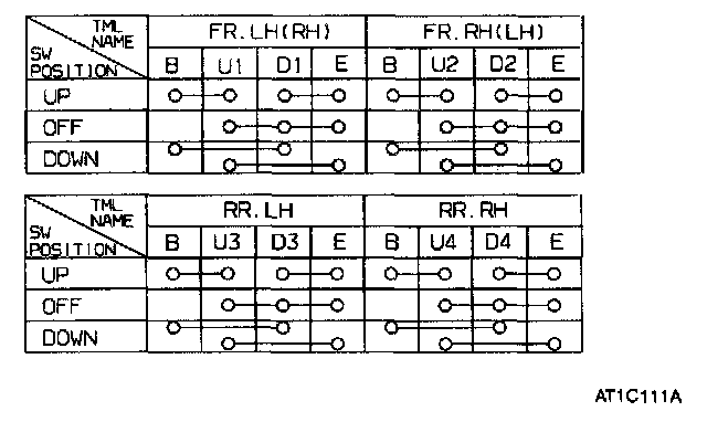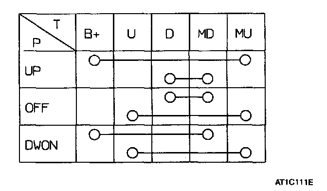 2. Check for continuity between the terminals. If continuity is not as specified in the table, replace the power window switch.