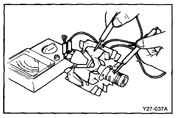 2. Check the rotor coil for a ground. Check that there is no continuity between the slip ring and the core. If there is continuity, replace rotor assembly.