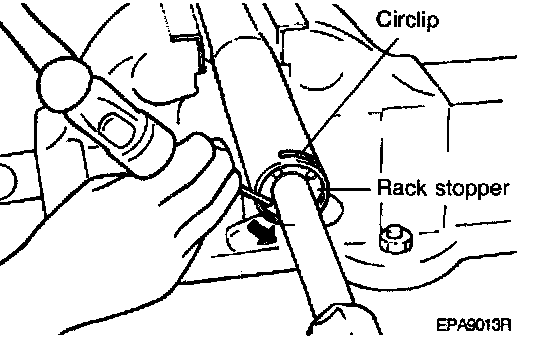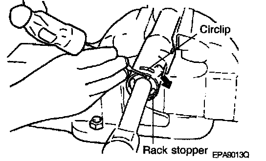 18. When the end of the circlip comes out from the notched hole of the housing rack cylinder, turn the rack stopper counterclockwise and remove the circlip.