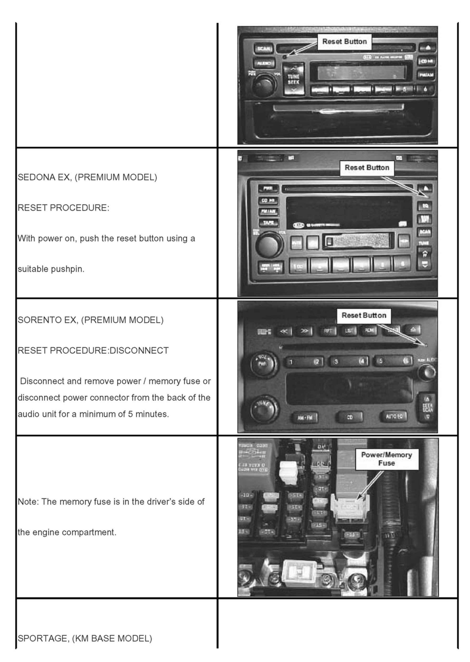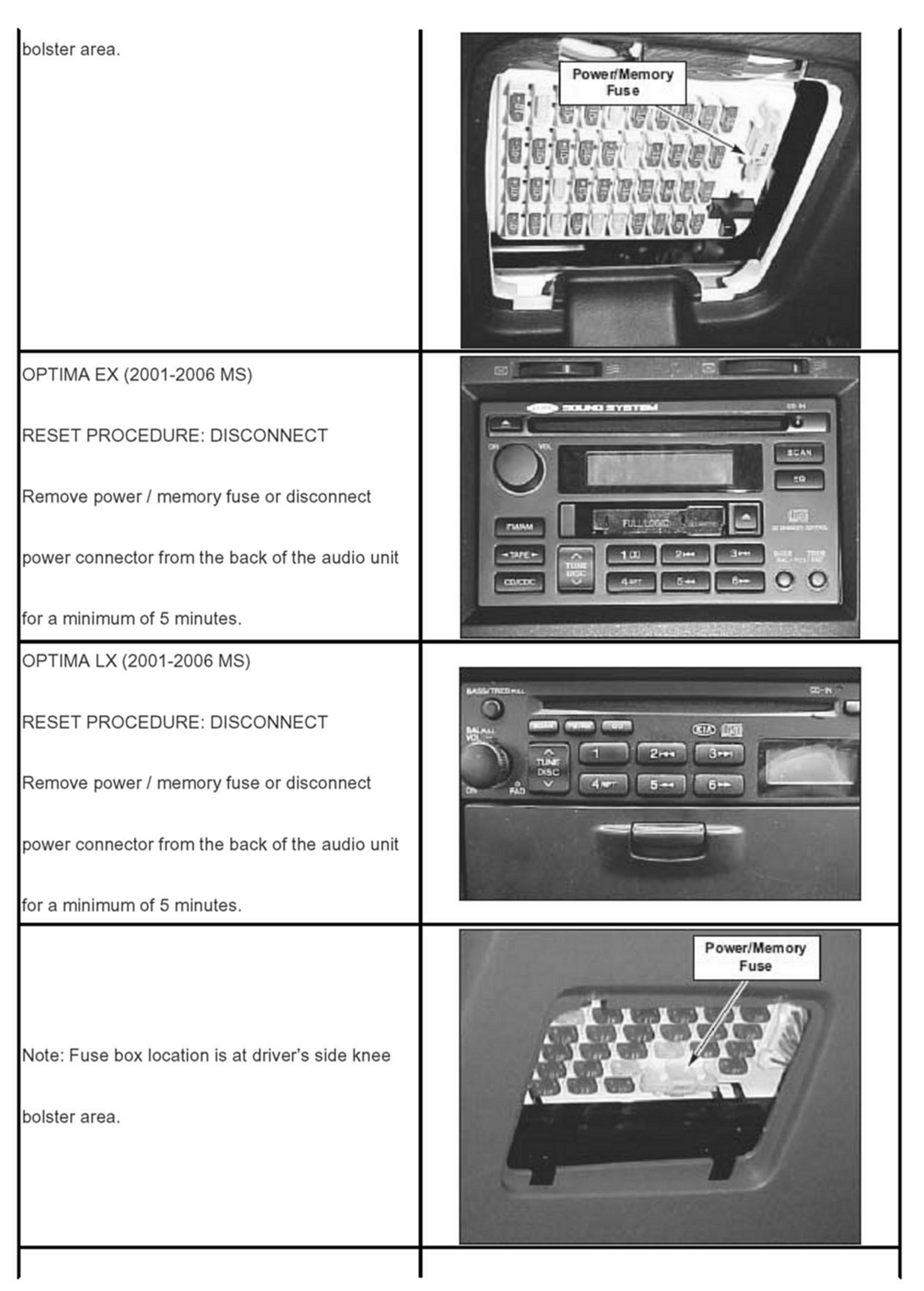 Model: Optima, Rio, Sedona, Sorento, Amanti, Sportage