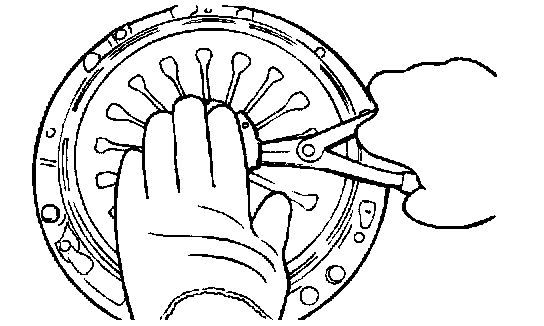 7. Loosen the bolts, which attach the clutch cover to the flywheel in a star pattern. Loosen the bolts in succession, one or two turns at a time, to avoid bending the cover flange.