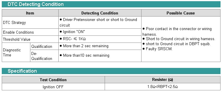 When short or decreased resistance in the driver side pretensioner's squib occurs. When the SRS warning light remains lit and a DTC code occurs, it means a short circuit or decreased resistance between the control module and Pretensioner harness.