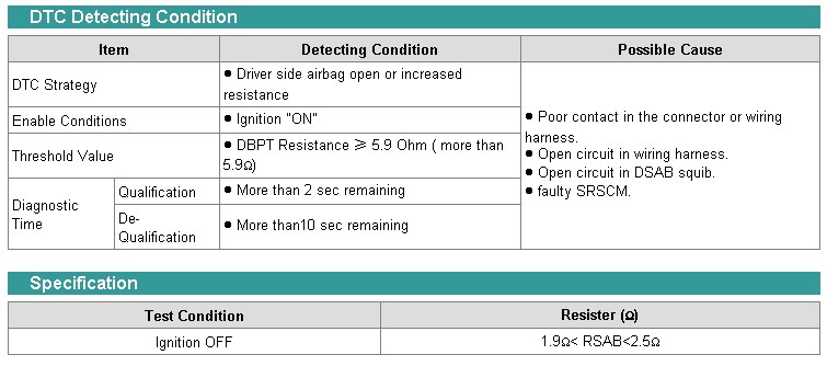 When an open or increased resistance in driver side airbag squib occurs. When the SRS warning light remains lit and a DTC code occurs, this means an open circuit, or increased resistance between the control module and airbag harness.