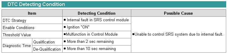 A self-diagnosis circuit is built into the SRS control module, When the ignition switch is turned ON, the SRSCM indicator light turns on and turns off, after about six seconds, if the system is operating normally. If the light does not come If the light does not turn on or does not turn back off after six second, or if it lights while driving, an abnormality in the system is indicated. The system must be inspected and repaired as soon as possible. For bettery serviceability, the cause of the malfunction is stored in memory. The data link circuit passes malfunction information from memory to the data link connector (DLC). This information can then be read with the scantool connected to the DLC (16P).