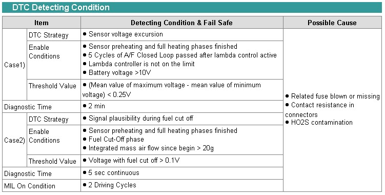 Due to possible oxygen sensor defects (e.g. reference air poisoning) or faults in the injection system (e.g. leaking fuel injector), the rear oxygen sensor may not provide the expected lean or rich signal level during fuel cut-off or full load condition. Hence, the oxygen sensor signal is checked for plausibility during this engine operating states. If same error code is set in the next driving cycle, the ECM illuminates the MIL.