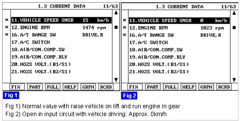 The ECM evaluates engine speed and mass air flow if there is no vehicle speed signal. This evaluation of both values will detect open circuit or short circuit errors on the wheel speed sensor. The ECM sets DTC P0501 if there is no vehicle speed signal from wheel speed sensor while both engine speed and mass air flow are higher than predetermined threshold during the predetermined time. If the same error code is set during two consecutive test cycles, the ECM illuminates the MIL.