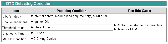 The ECM monitors RAM areas and communication connections between microcontroller and output drivers and sets DTC P0605 if failure is detected. If same error code is set in the next driving cycle, the ECM will illuminate the MIL.