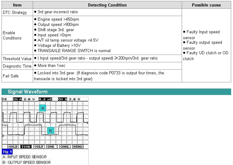 This code is set if the value of input shaft speed is not equal to the value of the output shaft, when multiplied by the 3rd gear ratio, while the transaxle is engaged in 3rd gear. This malfunction is mainly caused by mechanical troubles such as control valve sticking or solenoid valve malfuctioning rather than an electrical issue.