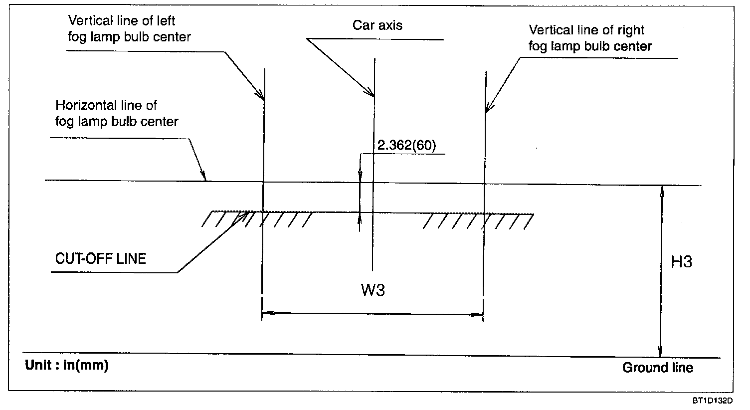 3. Turn the front fog lamp on without the driver aboard. The cut-off line should be projected in the allowable range (shaded region).