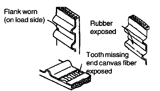 Canvas on the load side of the tooth flank worn down and rubber exposed (tooth width reduced)