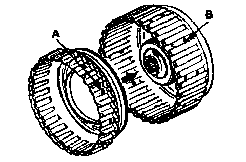 18. Align the spaces between the teeth (A) on the clutch plates, clutch discs, and reaction plate to the outer circumference hole (B) in the overdrive clutch retainer.