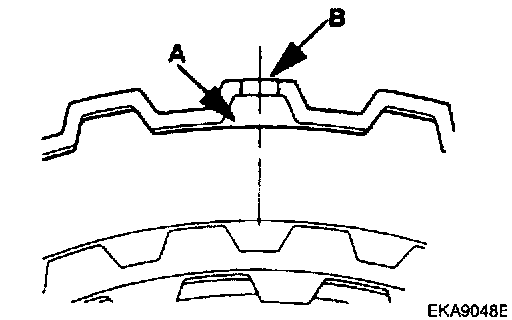 12. Align the spaces between the teeth (A) on the clutch plates, clutch discs, and reaction plate to the outer circumference hole (B) in the reverse clutch retainer.