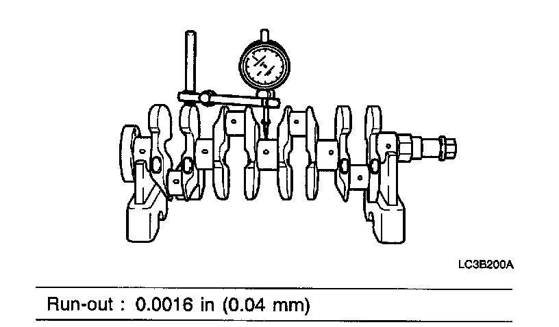 4. Measure crankshaft run-out at center journal. Replace crankshaft if it is not within specification.