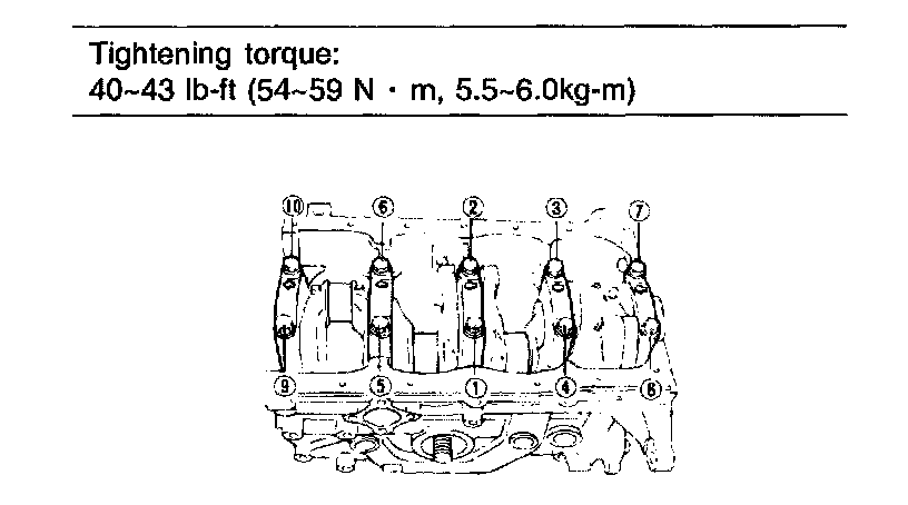 Main bearing cap bolts 40 - 43 ft. lbs. (54 - 59 Nm, 5.5 -6.0 kgf-cm)
