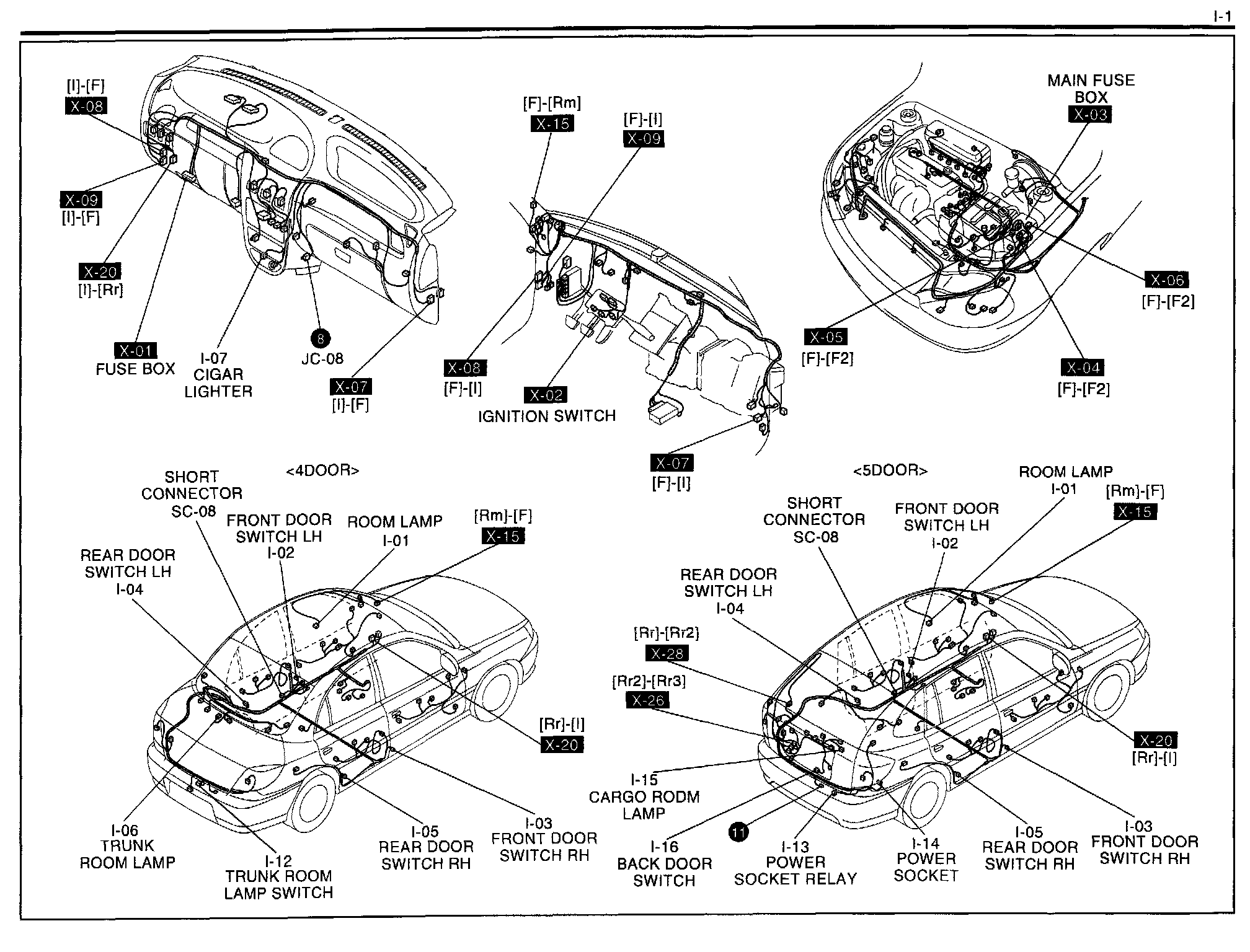 I-1 - Room Lamp, Trunk Room Lamp (4 Door), Cargo Room Lamp (5 Door), Power Socker (5 Door), Cigar Lighter Harness/Connector Symbols: