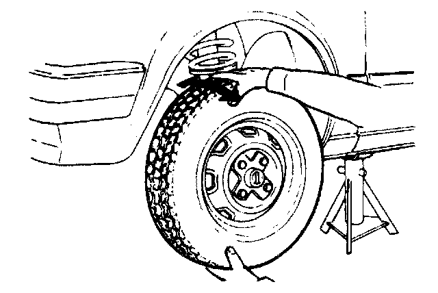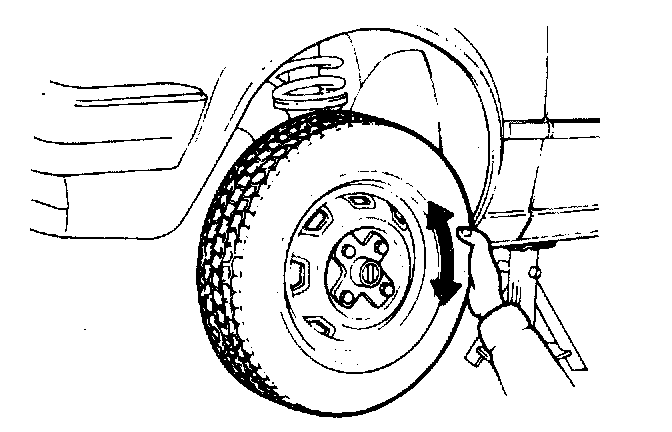 Wheel bearing end play1. Raise the front of the vehicle and check the looseness of front wheel bearings by rocking the tires at the top and bottom.