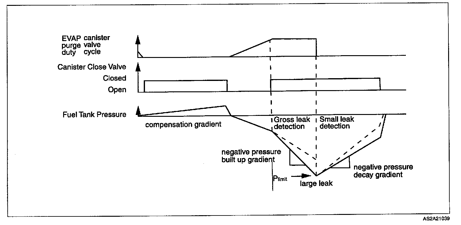The EVAP canister purge control valve is closed as soon as the maximum vacuum level is achieved. The rate of vacuum loss will be corrected by the above compensation gradient. A small leak is assumed if this corrected rate of vacuum loss is above a certain threshold. Then, the canister close valve is opened and the diagnosis is completed.