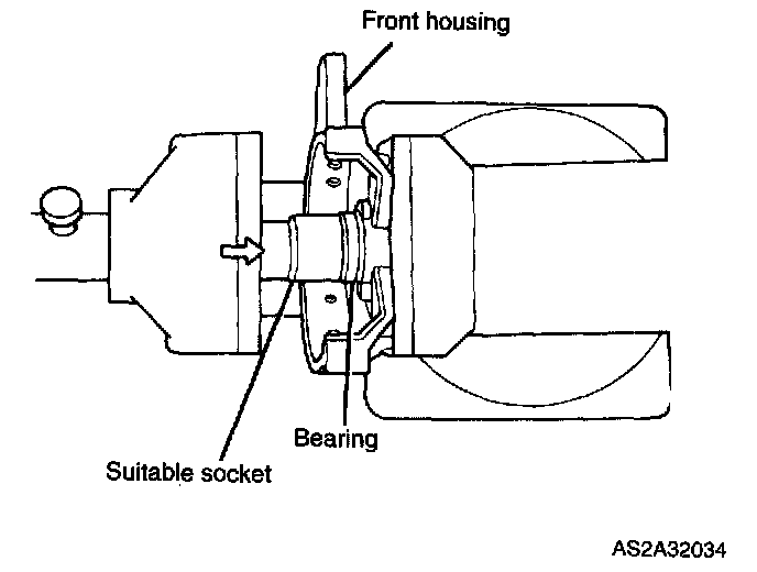 7. Assemble front bearing. Using a socket which exactly fits outer race of bearing, carefully push in front bearing. Use a hand press or a vise.