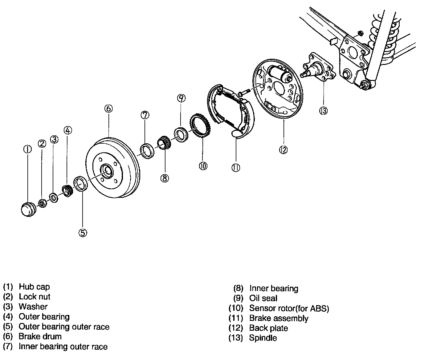 13. Position the brake drum bearings and hub assembly on the spindle.
