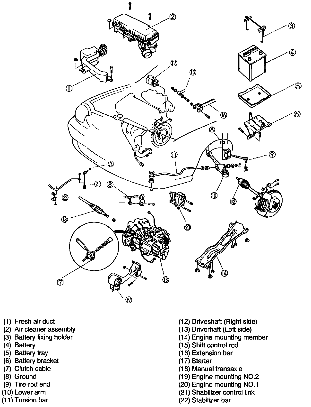 21. Remove the engine support bar SST (OK201 170 AAOA).