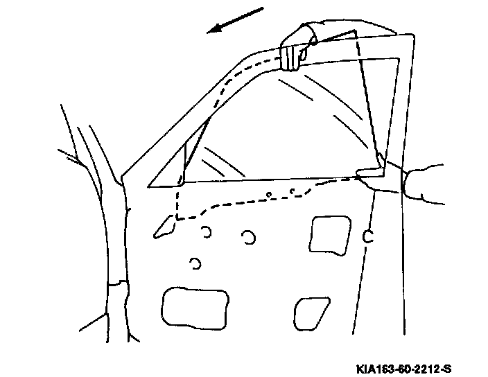 a. Position glass carefully. Hold glass from both its inner and outer surfaces, and while tilting it toward hinge side of door, place it on small bracket on window regulator assembly.