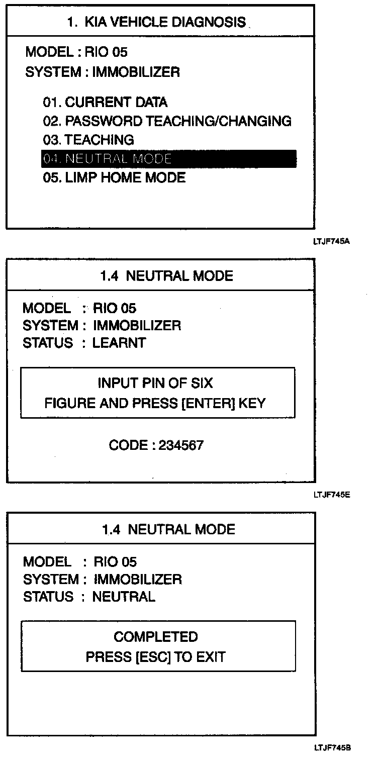 Ex) when lost key, Neutralize the ECM then teach keys. (Refer to the Things to do when Key & PIN Code the ECM can be set to the "neutral" status by a scanner. A valid ignition key is inserted and after ignition on is recorded, the ECM requests the vehicle specific data from the scanner. The communication messages are described at "Neutral Mode". After successfully receiving the data, the ECM is neutralized.