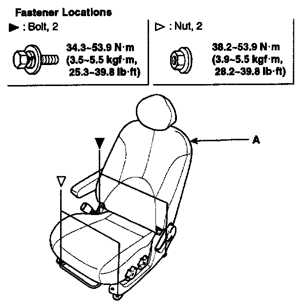 2. After loosening the seat assembly mounting bolt and nut, remove the seat assembly (A).