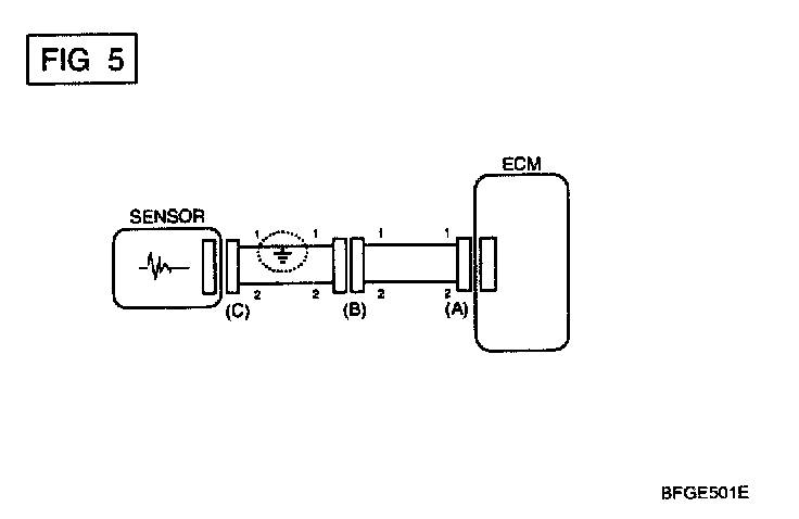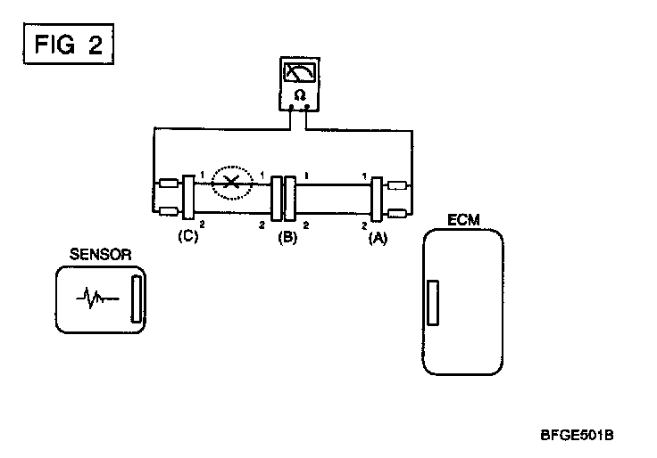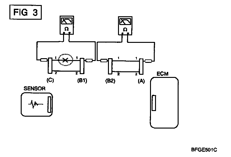 b. Disconnect connector (B), and measure for resistance between connector (C) and (B1) and between (B2). and (A) as shown in [FIG. 3].