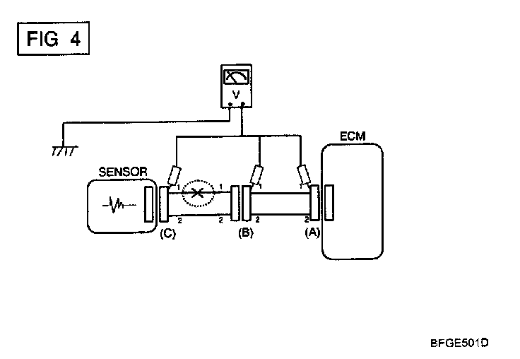 a. With each connector still connected, measure the voltage between the chassis ground and terminal 1 of each connectors (A), (B) and (C) as shown in [FIG. 4].