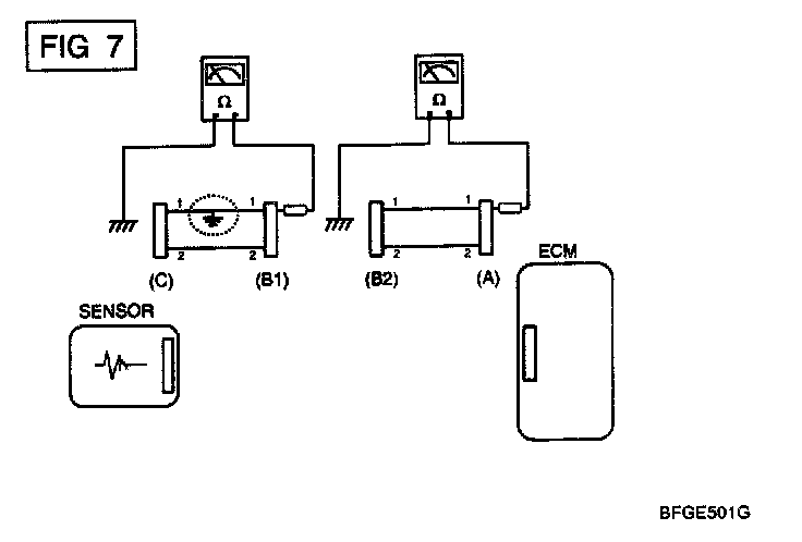 b. Disconnect connector (B), and measure the resistance between connector (A) and chassis ground, and between (B1) and chassis ground as shown in [FIG. 7].