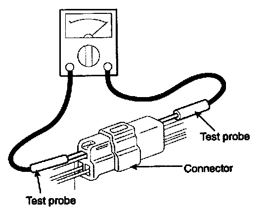 11. When using a circuit tester to check continuity or voltage on connector terminals, insert the test probe into the harness side. If the connector is a sealed connector, insert the test probe through the hole in the rubber cap until contacts the terminal, being careful not to damage the insulation of the wires.