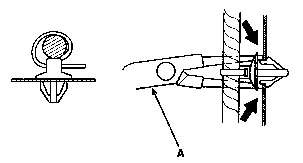 3. Slip pliers (A) under the clip base and through the hole at an angle, and then squeeze the expansion tabs to release the clip.