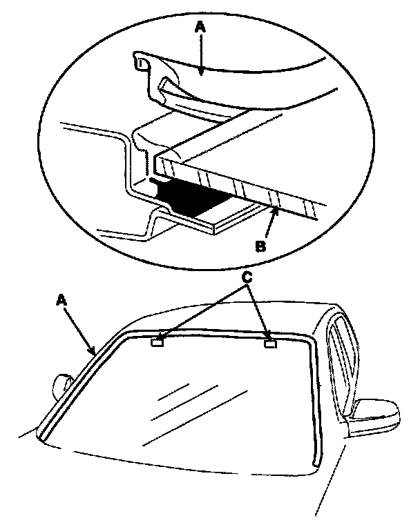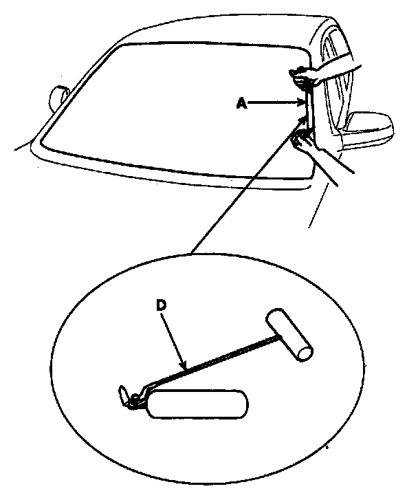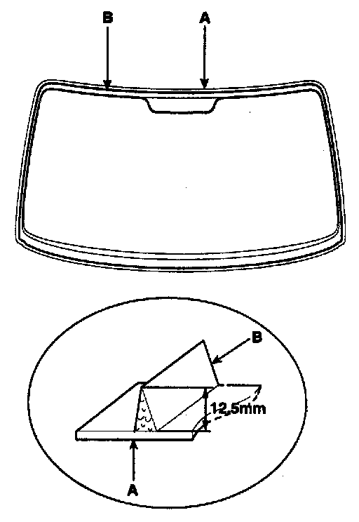 2. Remove the molding (A) from the edge of the windshield (B). If necessary, cut the molding with a utility knife.