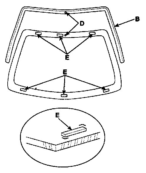 3. When attaching the molding, matching the corner of glass and molding and attach the windshield glass pad (E) to the designated place.