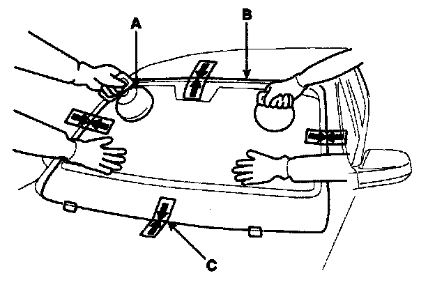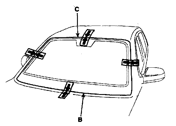 4. Install the windshield glass (B) temporarily with making sure to position them on the center, and then place the alignment mark (C).