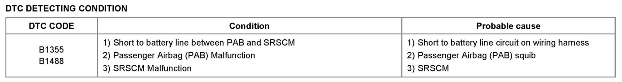 The Passenger Airbag circuit consists of the SRSCM and the Passenger Airbag (PAB) which has two squib circuits. The SRSCM sets above DTC(s) if it detects short to battery line on the PAB circuit.