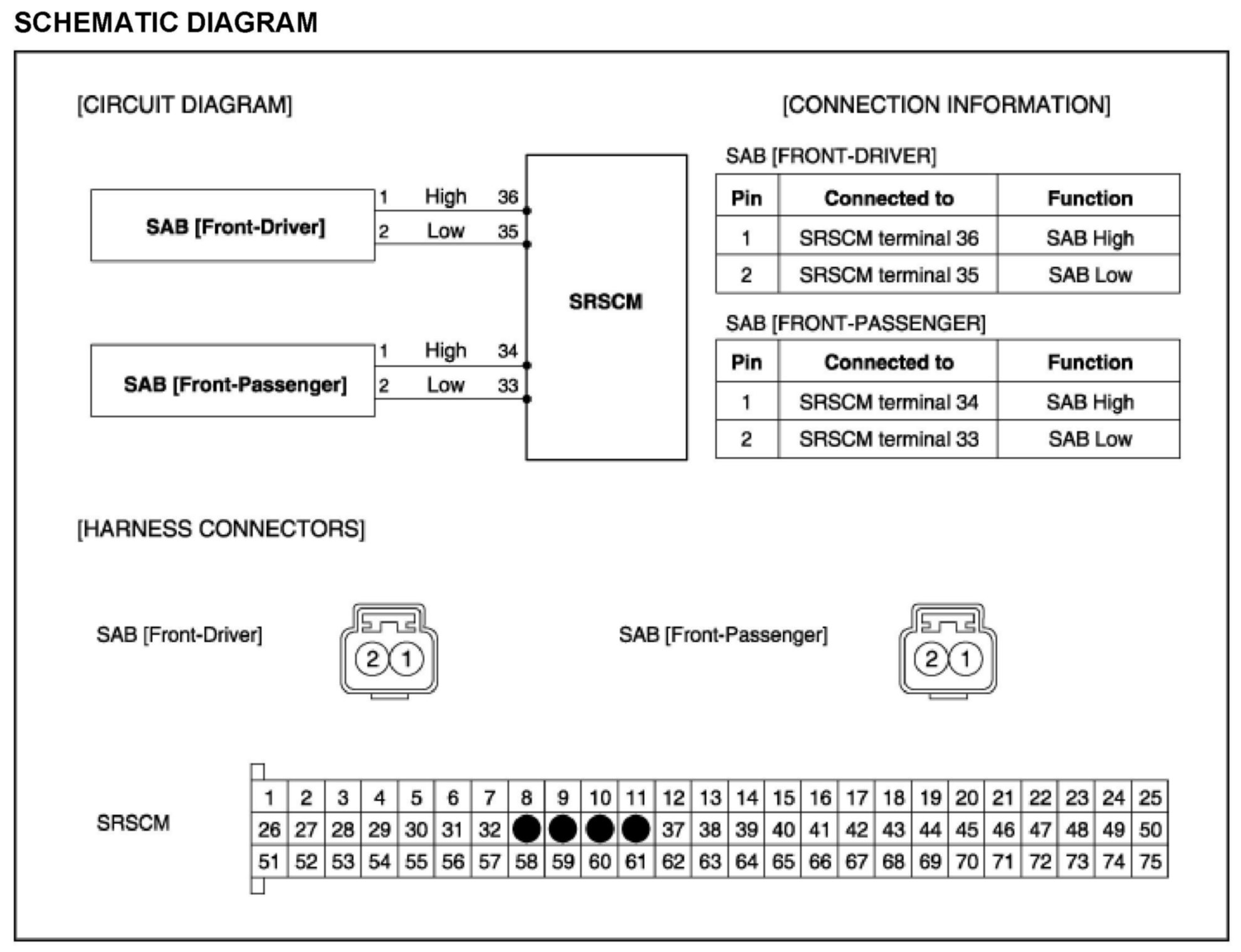 The Side Airbag circuit consists of the SRSCM and two Side Airbag (SAB). The SRSCM sets above DTC(s) if it detects short to battery line on the SAB circuit.