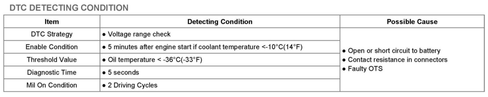 PCM sets DTC P0198 if the PCM detects signal voltage higher than the possible range of a properly operating OTS.