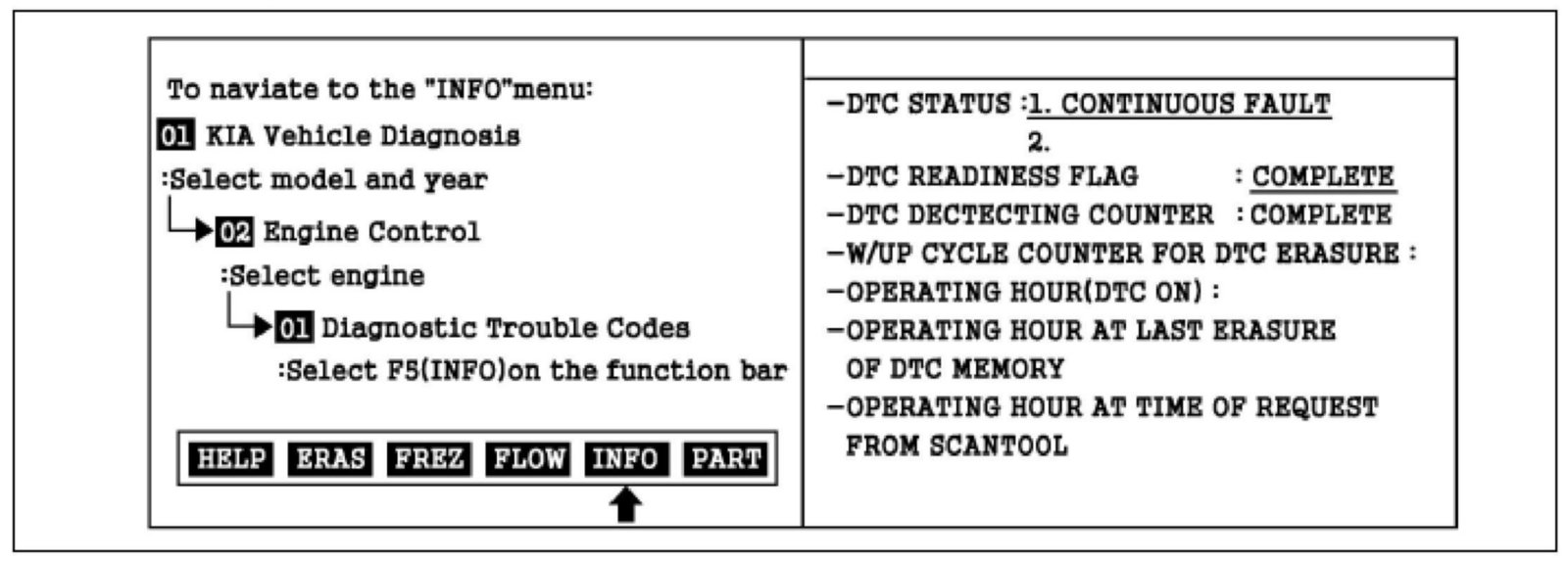 2. Press F5(INFO) and confirm that "DTC Readiness Flag" indicates "Complete". If not, drive the vehicle within conditions noted in the freeze frame data or enable conditions.