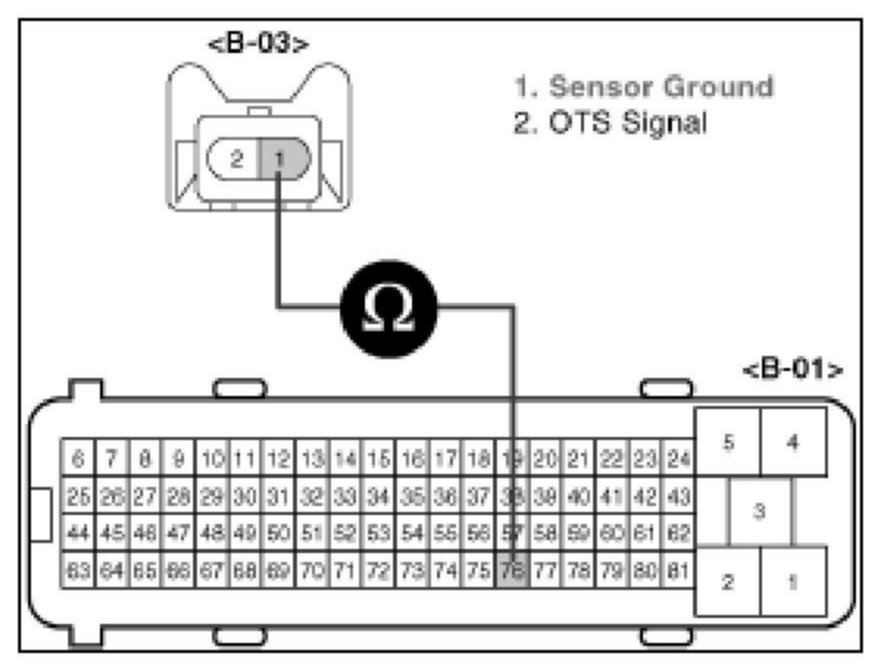 3. Measure resistance between terminals 1 of the OTS harness connector and 76 of the PCM harness connector.