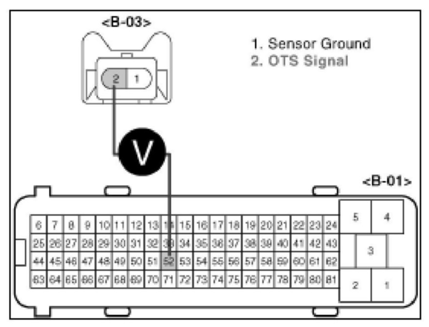 3. Measure voltage between terminals 2 of the OTS harness connector and 52 of the PCM harness connector.