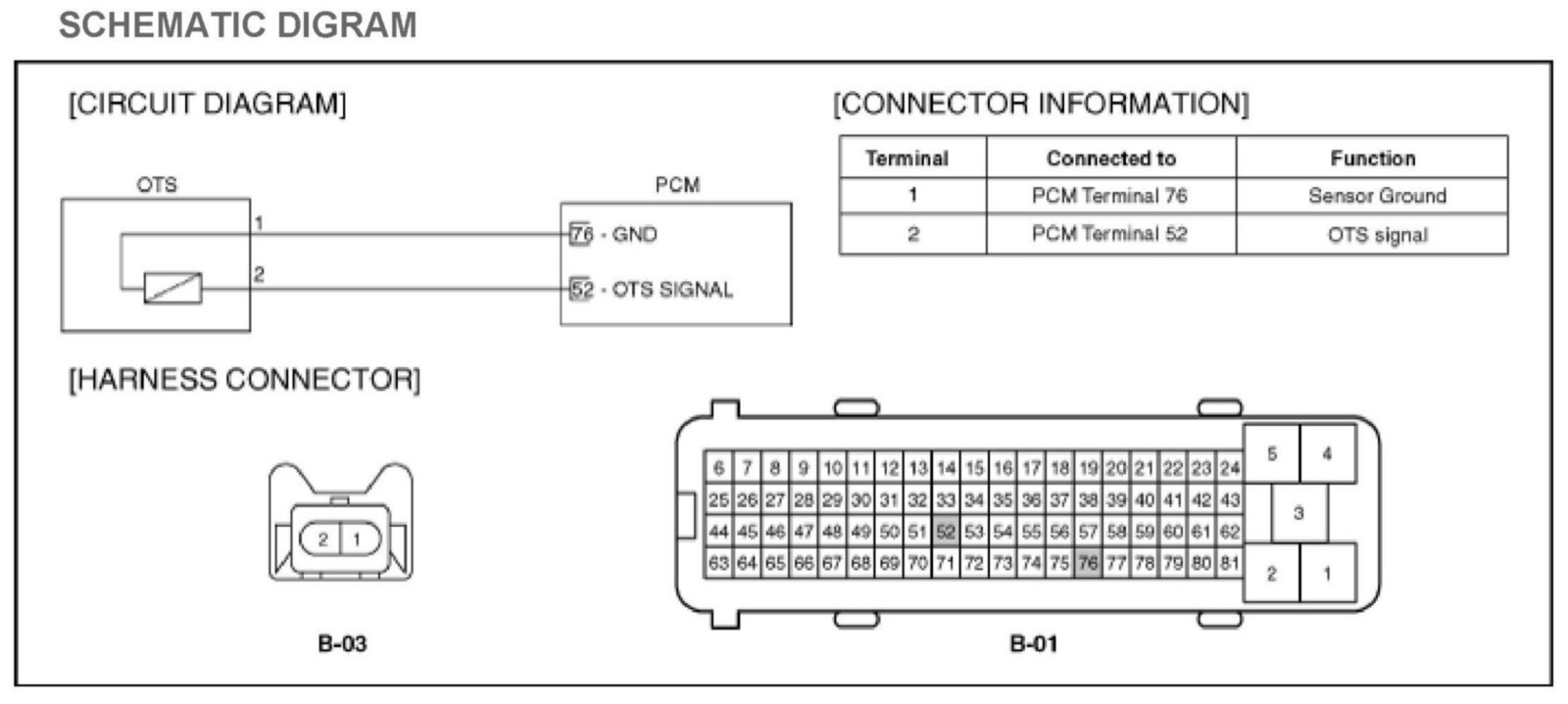 2. Measure resistance between terminals 2 of the OTS harness connector and 52 of the PCM harness connector.