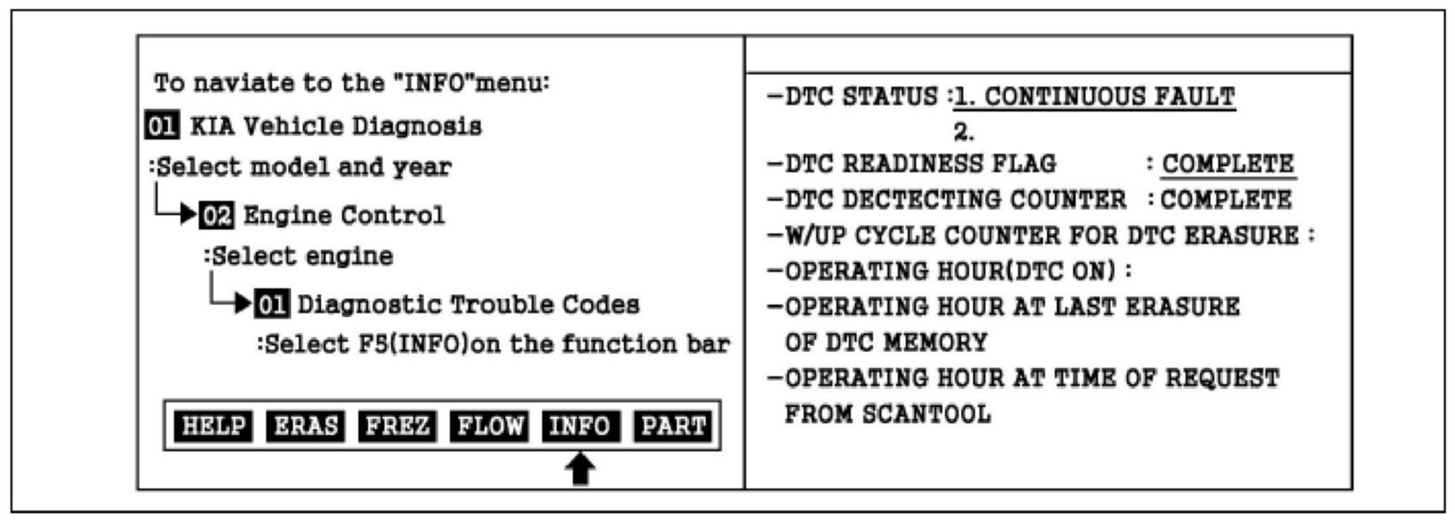 2. Press F5(INFO) and confirm that "DTC Readiness Flag" indicates "Complete". If not, drive the vehicle within conditions noted in the freeze frame data or enable conditions.
