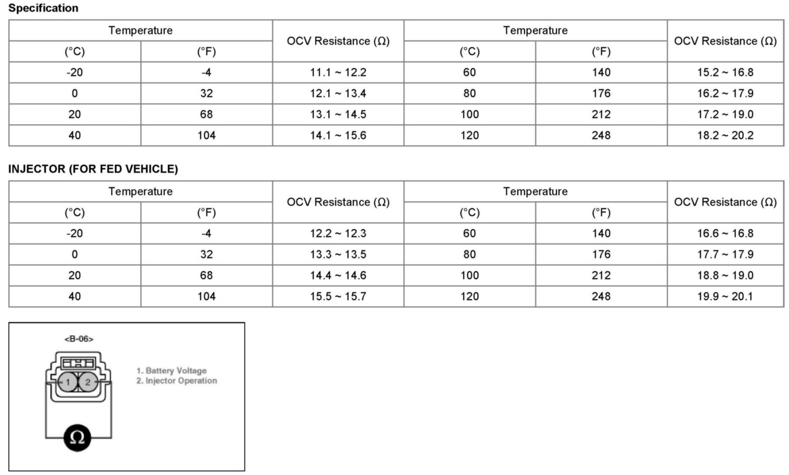 Based on information from various sensors, the PCM measures the fuel injection amount. The fuel injector is a solenoid-operated valve and the fuel injection amount is controlled by length of time the fuel injector is held open. The PCM controls each injector by grounding the control circuit. When the PCM energizes the injector by grounding the control circuit, the circuit voltage should be low (theoretically 0 V) and the fuel is injected. When the PCM de-energizes the injector by opening control circuit, the fuel injector is closed and circuit voltage should momentarily peak.