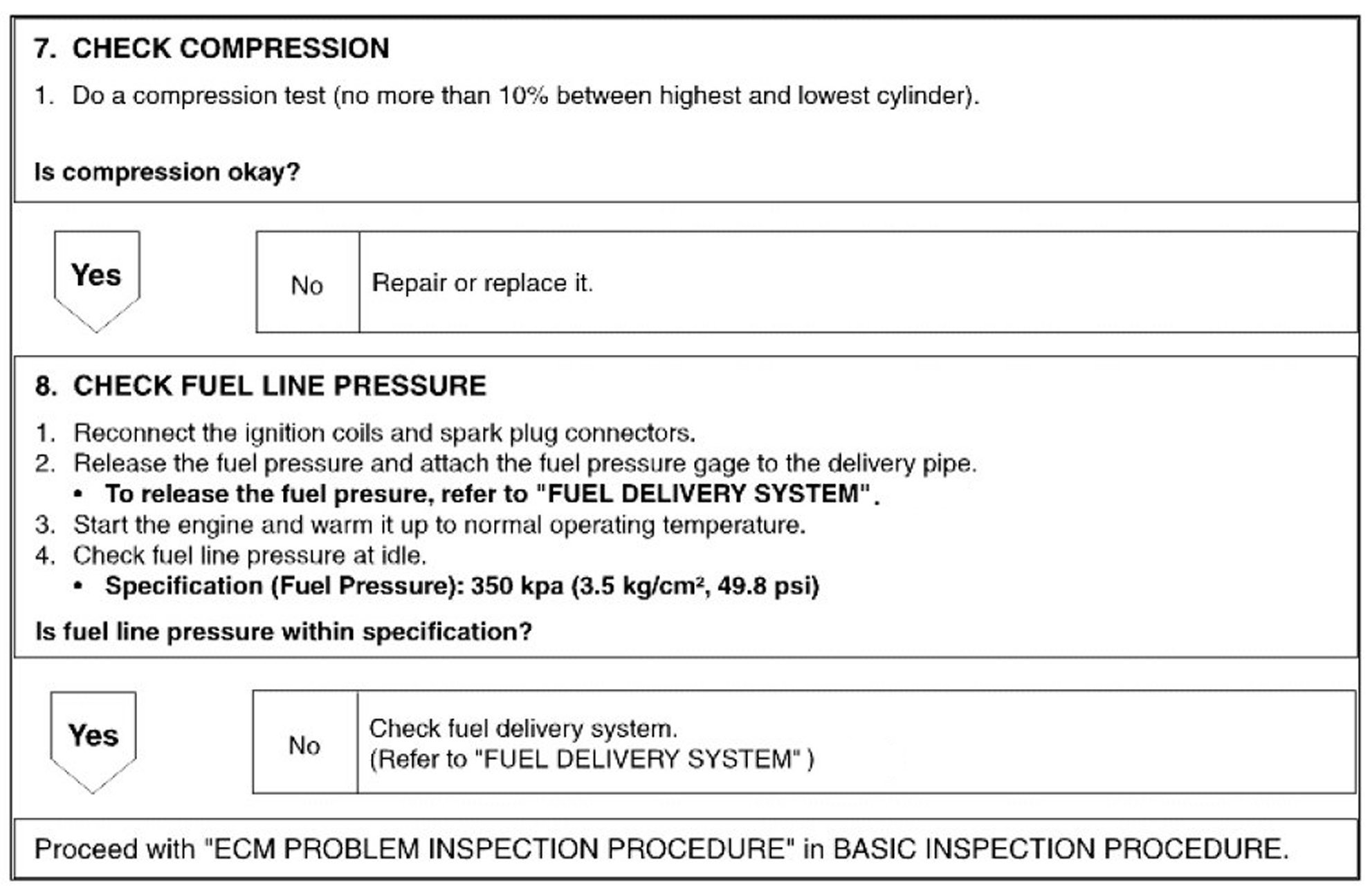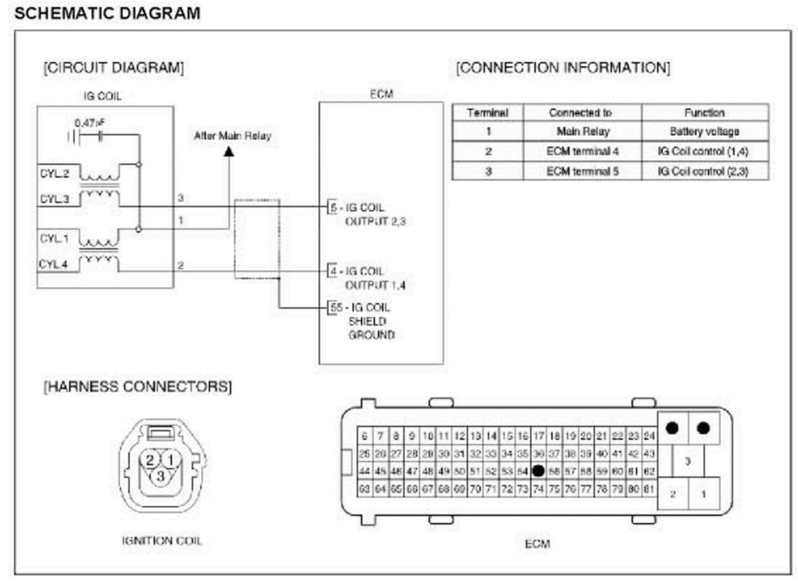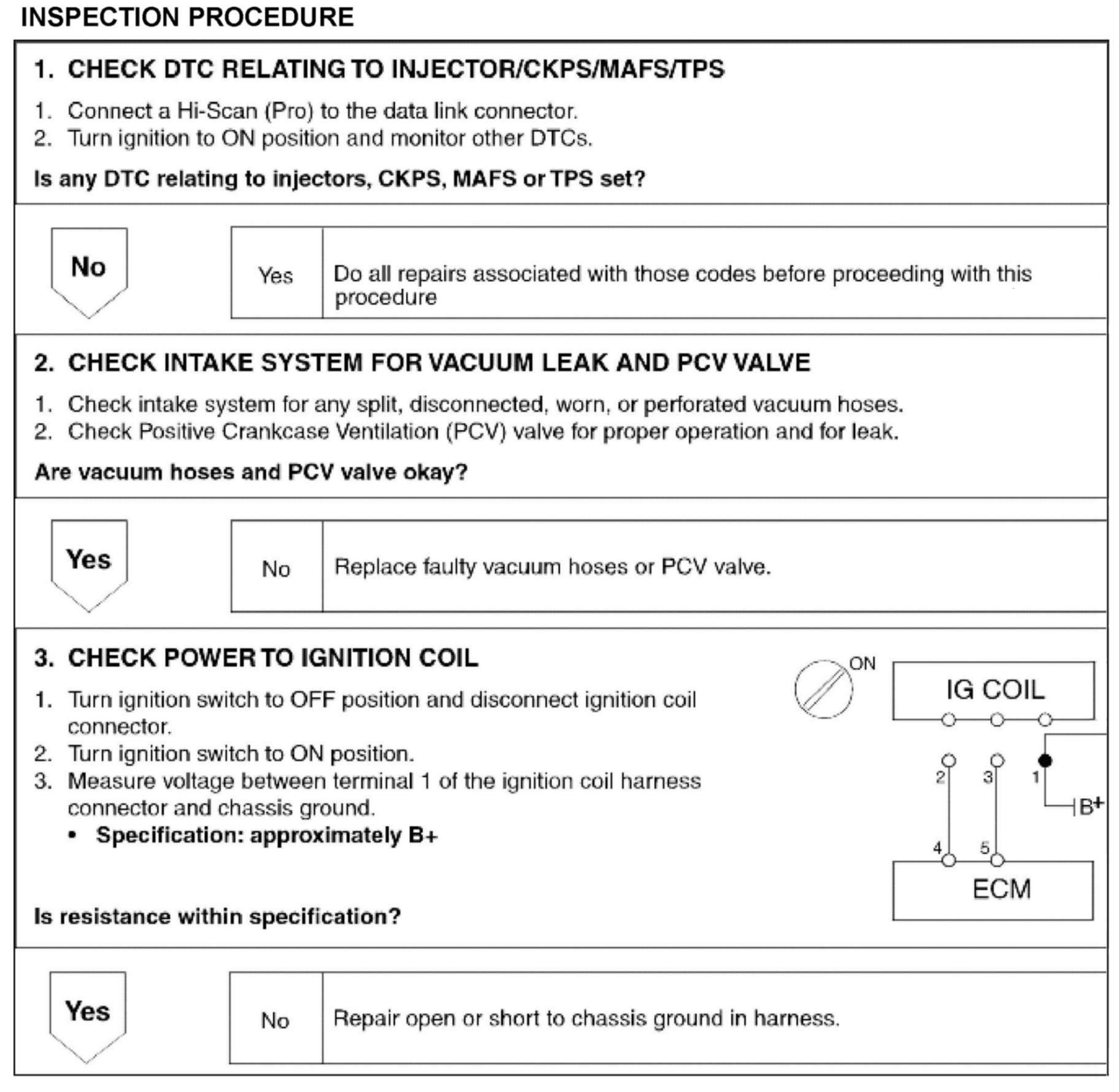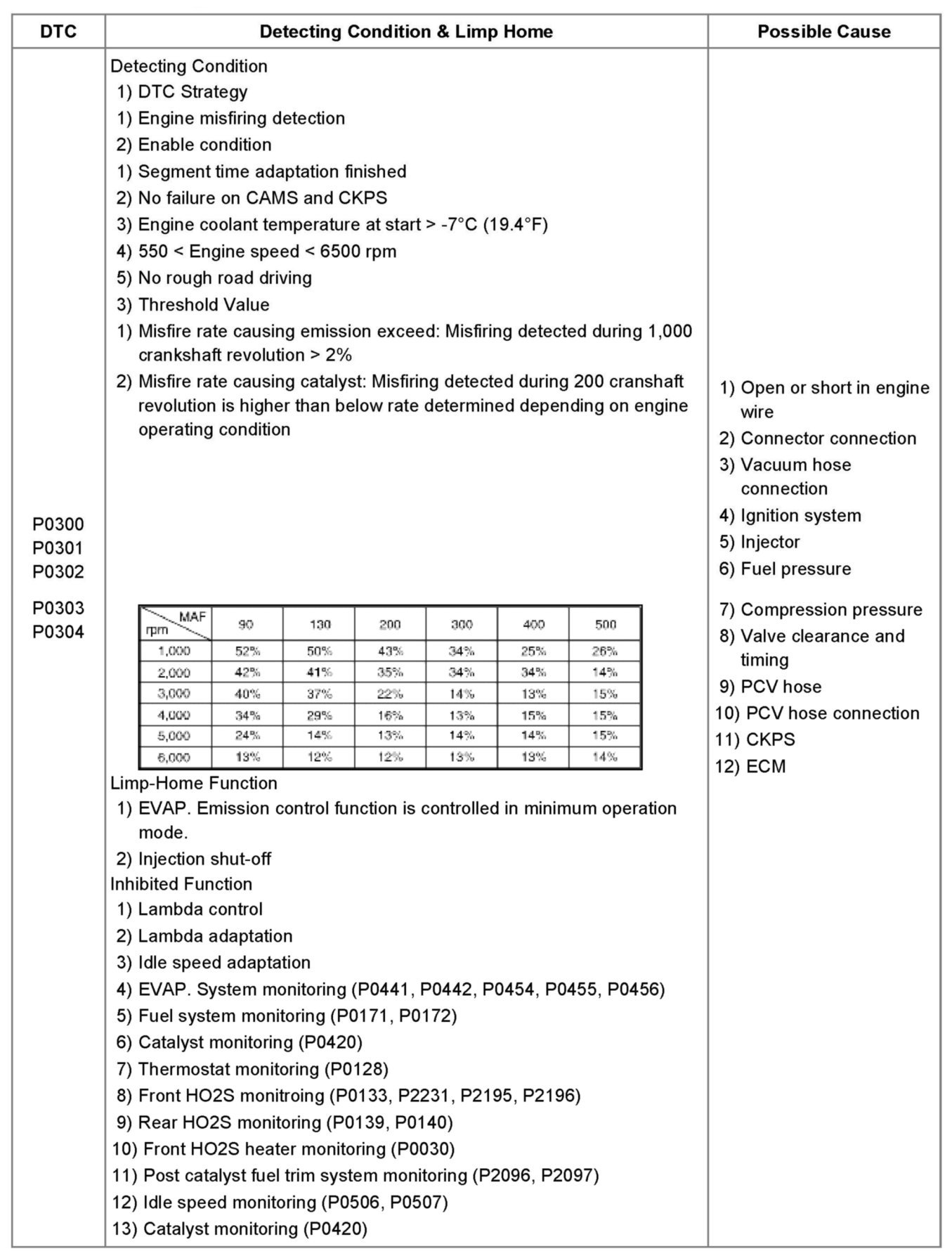 The ECM must monitor the engine for misfiring possibly caused by ignition coil defects or injector fails. If misfiring is detected, the ECM identify the cylinder(s) that has(have) misfired and calculate misfiring rate for a given duration. The DTC for Misfire (P0301 to 0304) is set as soon as misfiring rate exceed the limit which result in damage to the catalyst or increase emissions. The ECM stores individual DTC for the cylinder which has more than 10% of total misfire rate. With more than two cylinders misfire detection, the ECM sets P0300.