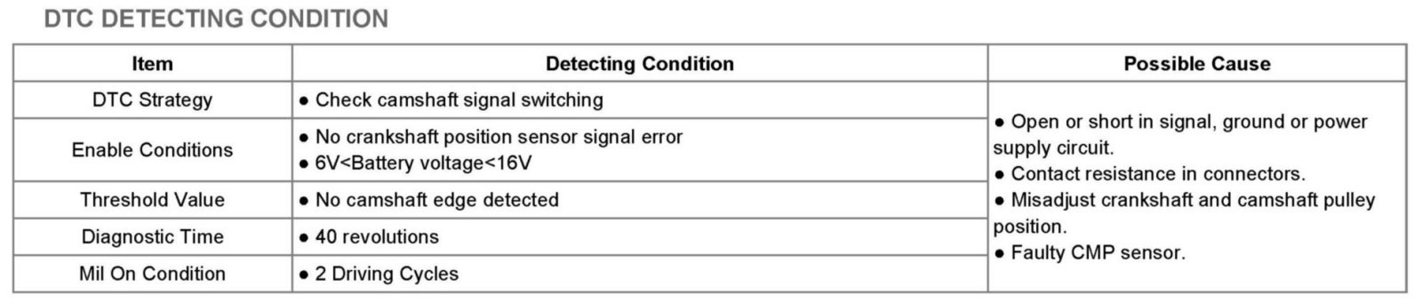 The PCM monitors the camshaft sensor signal transition position which must change only once per crankshaft revolution. If no camshaft signal is detected while crankshaft signal is detected, the PCM sets DTC P0340.
