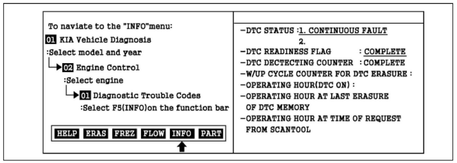 2. Press F5(INFO) and confirm that "DTC Readiness Flag" indicates "Complete". If not, drive the vehicle within conditions noted in the freeze frame data or enable conditions.