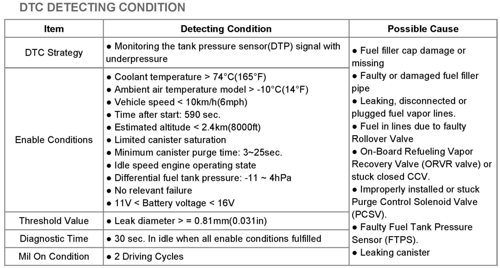 The PCM closes the Canister Close Valve (CCV) at the charcoal canister to seal off the evaporative emission system and then opens purge control valve (PCSV) to generate a vacuum in the fuel tank. After vacuum generation, the PCM measures pressure differential curve in the fuel tank and sets DTC P0442 or P0456 if the vacuum generated within a monitoring period increases above a defined threshold. If same error code is set in the next driving cycle, the PCM illuminates the MIL.