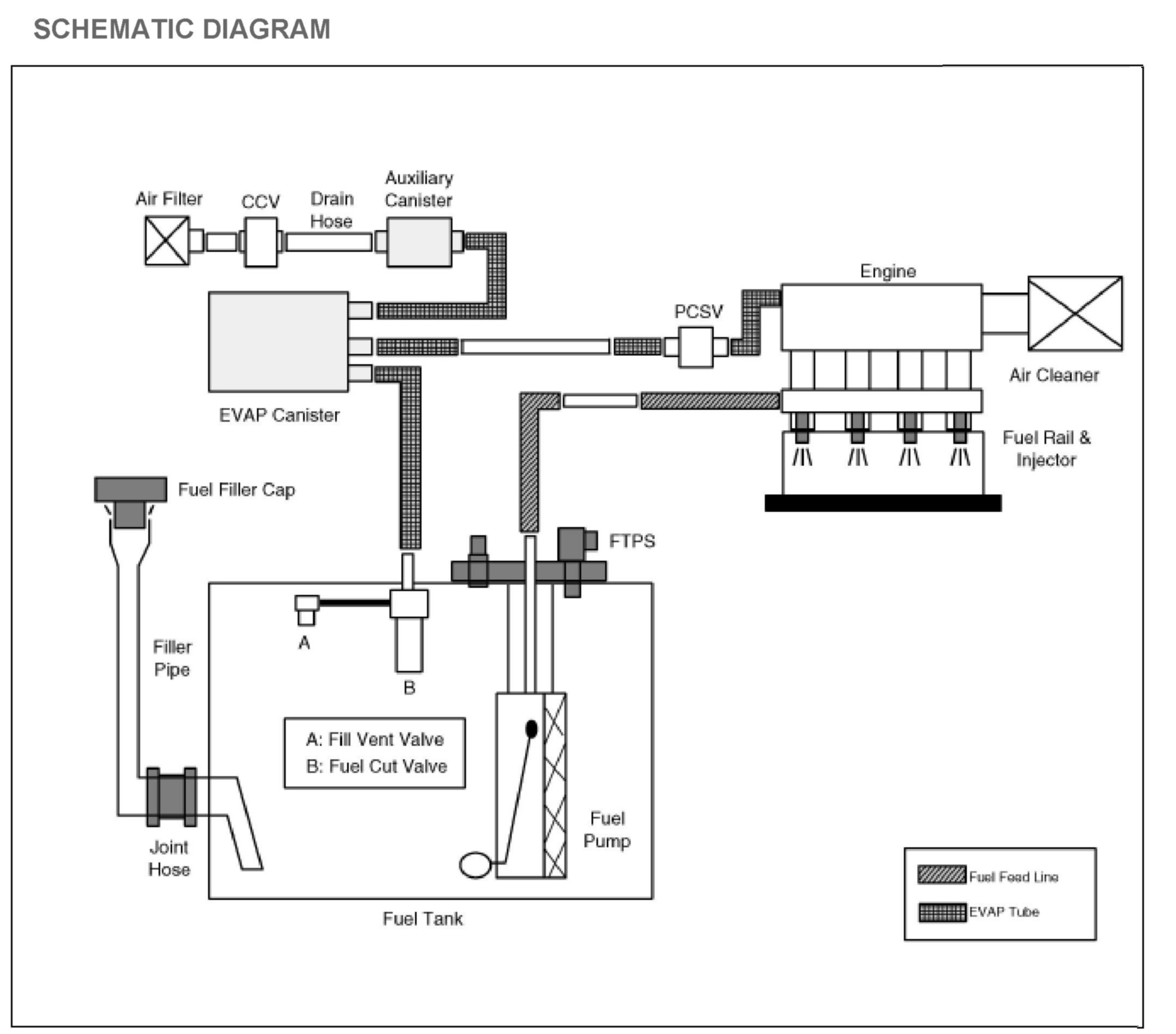 Due to the increasing ambient temperature of the fuel and the return of unused hot fuel from the engine, fuel vapors are generated in the tank. In order to control the release of these vapors to the atmosphere, the evaporative emissions control system is used. The evaporative emission control system reduces hydrocarbon (HC) emissions by trapping fuel tank vapors until they can be burned in the combustion process. Evaporating fuel is stored in a charcoal canister until it can be flushed into the intake manifold. The evaporative emission control system is made up of a fuel tank that can be completely sealed from outside air, a Fuel Tank Pressure Sensor (FTPS), a Canister Close Valve (CCV) that seals the canister from the outside air, a canister filled with activated charcoal granules, a Purge Control Solenoid Valve (PCSV). The evaporative emission system can be checked for leaks by sealing the system off from the outside air, creating a vacuum, and monitoring if the system can hold that vacuum sufficiently for a set amount of time. If it cannot, a leak exists somewhere in the system.