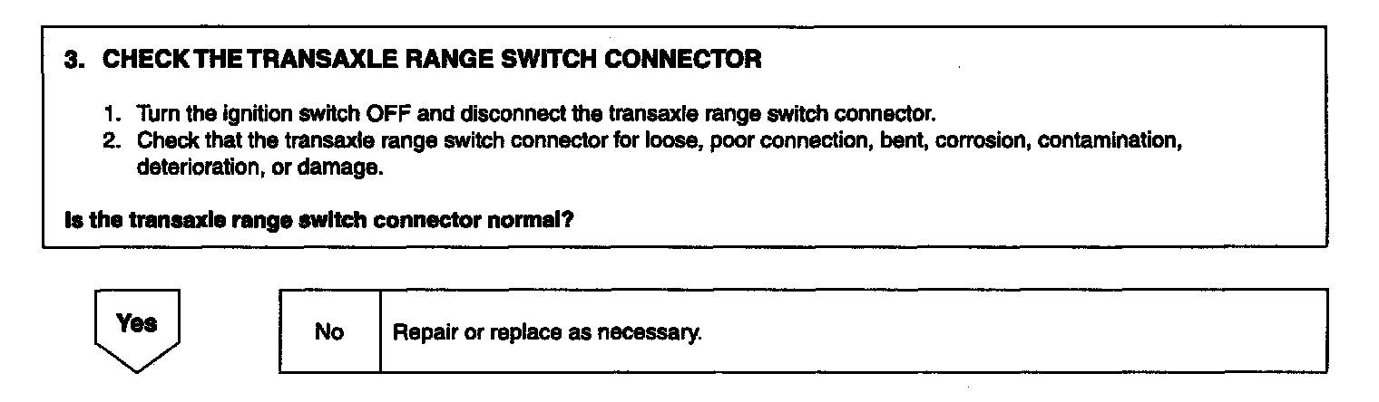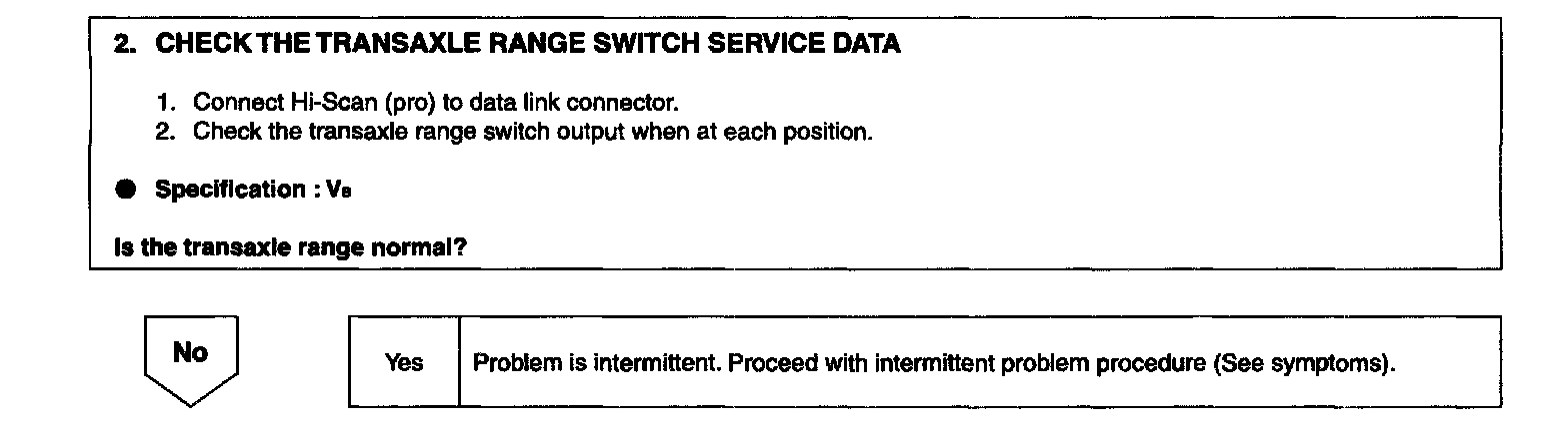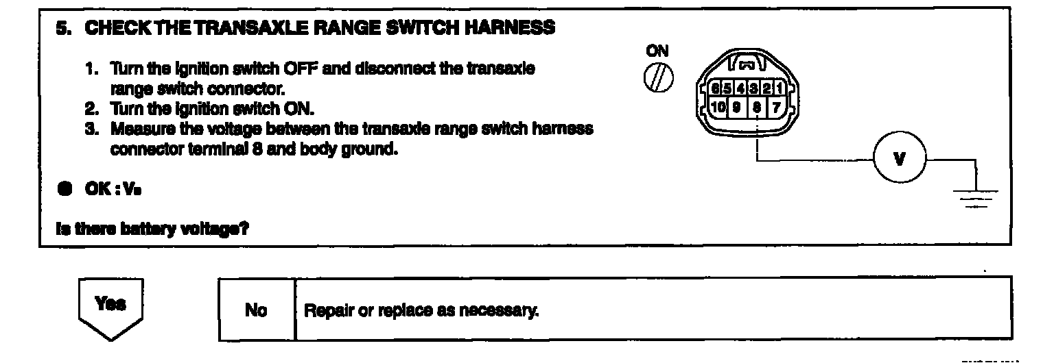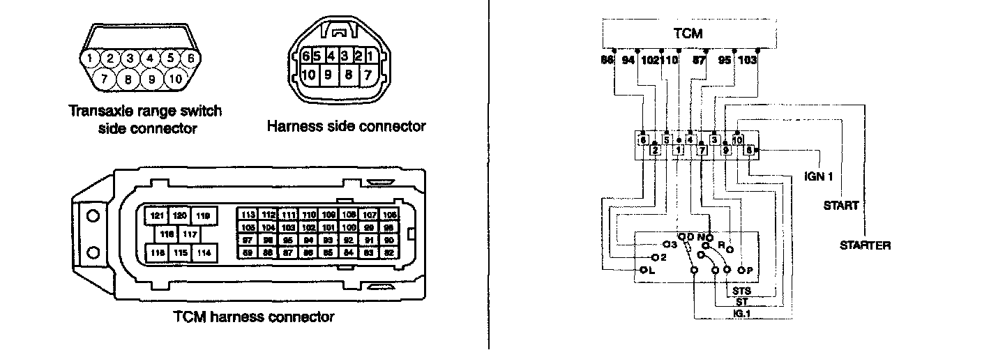 The TCM monitors this voltage, which corresponds to the position of the transaxle gear shift lever to determine desired gear and electronic pressure control. The transaxle range switch is located on the top of the transaxle, and also contains the neutral/start circuit.